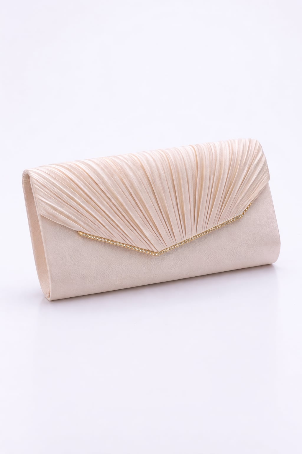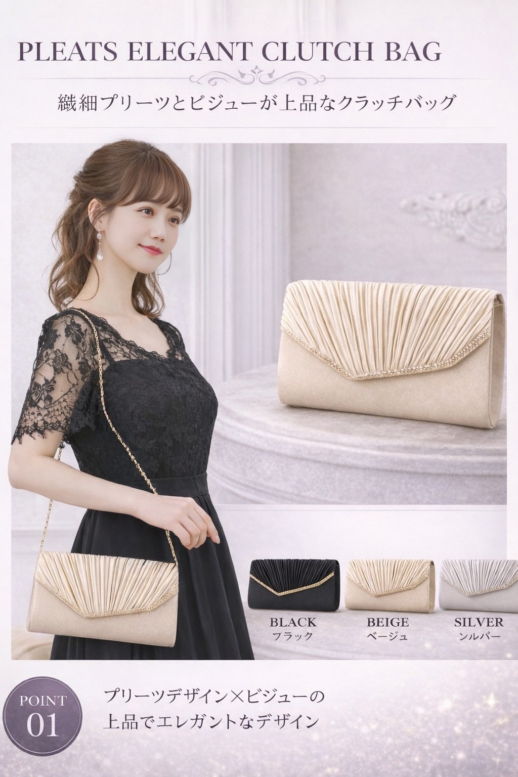繊細なプリーツと上品なビジューが印象的な、華やかさと実用性を兼ね備えたパーティーバッグ。