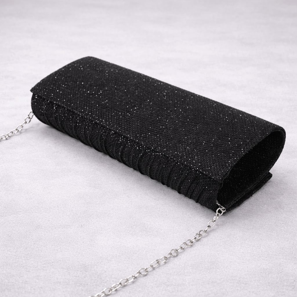 このクラッチバッグは、煌めくラメ素材が使用され、シンプルながらも上品なカシュクールデザインが特徴です。結婚式やパーティーシーン、お食事会、謝恩会といったフォーマルな場面で、服装を美しく引き立ててくれます。バッグの正面には華やかなプリーツが施されており、スタイルに洗練された輝きをプラスします。