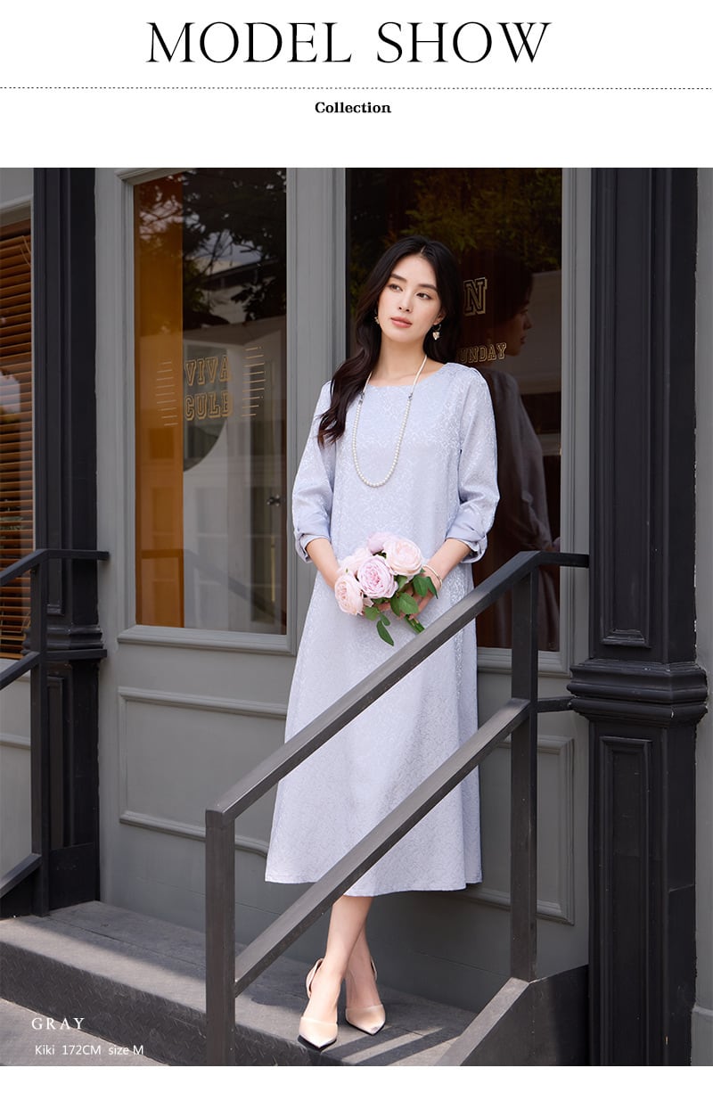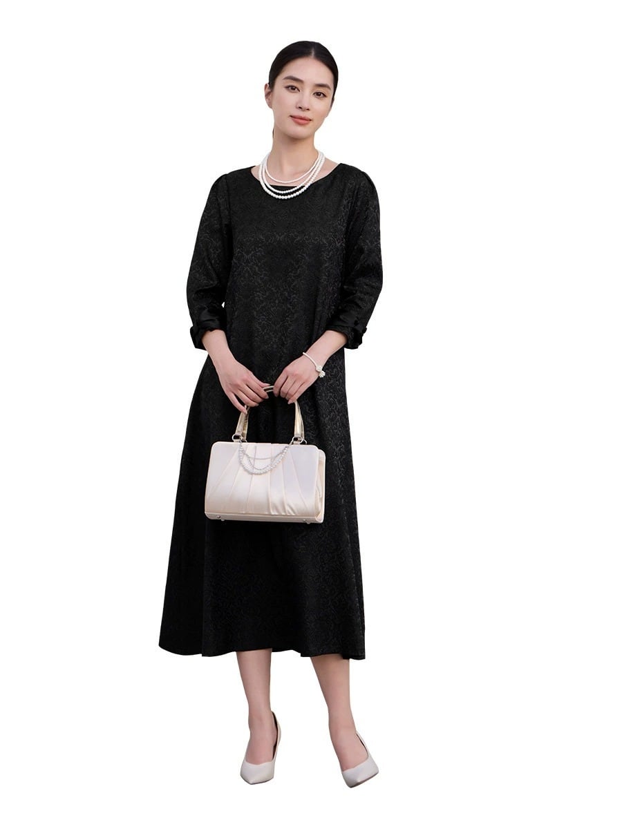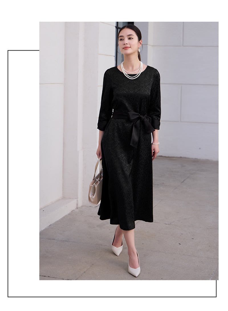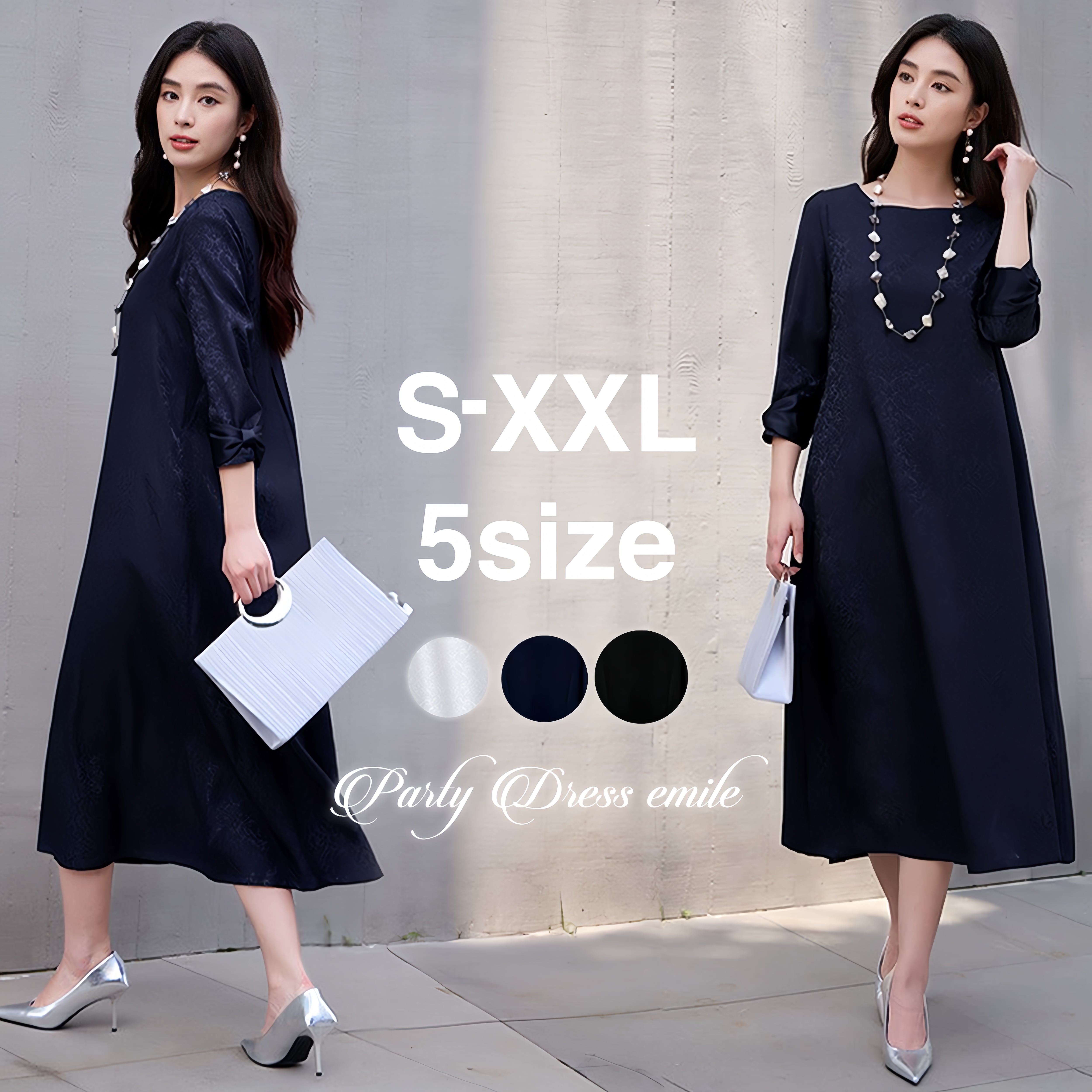 ご来店誠にありがとう御座います。 当店公式LINE【emile】にて割引クーポンをお配りしております。 LINE 追加特典 ・LINE追加で初回割引クーポン ・LINE限定クーポン ・新商品 SALE先行告知 お問い合わせ、ご質問はこちらから 【公式LINE】emile https://line.me/R/ti/p/%40vcv8428j ID:【@vcv8428j】 ※店舗担当者とトークで気軽にお問い合わせ頂けます。 ---------------------------------------------------- ご覧いただきましてありがとうございます。 「パーティードレス通販emile」でございます。 結婚式、パーティー、二次会、学校行事、デート、記念日、『特別な一日に。』 どんな場面のお洋服でも、こだわりの一着がみつかります! お手頃プライスと種類の多さで人気急上昇中! emileであなただけの特別な一着を見つけて下さい。 お呼ばれや特別な日のためのパーティードレスをメインに、アクセサリーやバッグ、シューズなど取り扱っております。大きいサイズも豊富に取りそろえております。 1点1点専用アイロンがけを行ってから出荷致します。心を込めて出荷させて頂きます。 上品なジャカード素材が映える、大人のためのパーティードレス。 繊細な織り柄が落ち着いた華やかさを演出し、結婚式お呼ばれや二次会などフォーマルなシーンにぴったりです。 ストンと落ちるAラインシルエットで体のラインを拾いにくく、自然に体型カバー。 七分袖の程よい透け感が二の腕をさりげなくカバーし、上品な印象に仕上げます。 取り外し可能なウエストリボン付きの2WAY仕様で、メリハリのある着こなしもシンプルな着こなしも楽しめます。 パーティードレスとしてはもちろん、お呼ばれドレスとして長く活躍する一着です。 サイズ(約) S バスト90cm 肩幅34cm 袖丈46cm 袖口26cm 裾丈118cm M バスト94cm 肩幅35cm 袖丈47cm 袖口27cm 裾丈119cm L バスト98cm 肩幅36cm 袖丈48cm 袖口28cm 裾丈120cm XL バスト102cm 肩幅37cm 袖丈49cm 袖口29cm 裾丈121cm XXL バスト106cm 肩幅38cm 袖丈50cm 袖口30cm 裾丈122cm モデルサイズ Sサイズ着用 身長172cm 体重52kg バスト83cm ウエスト64cm ヒップ88cm カラー グレー ネイビー ブラック