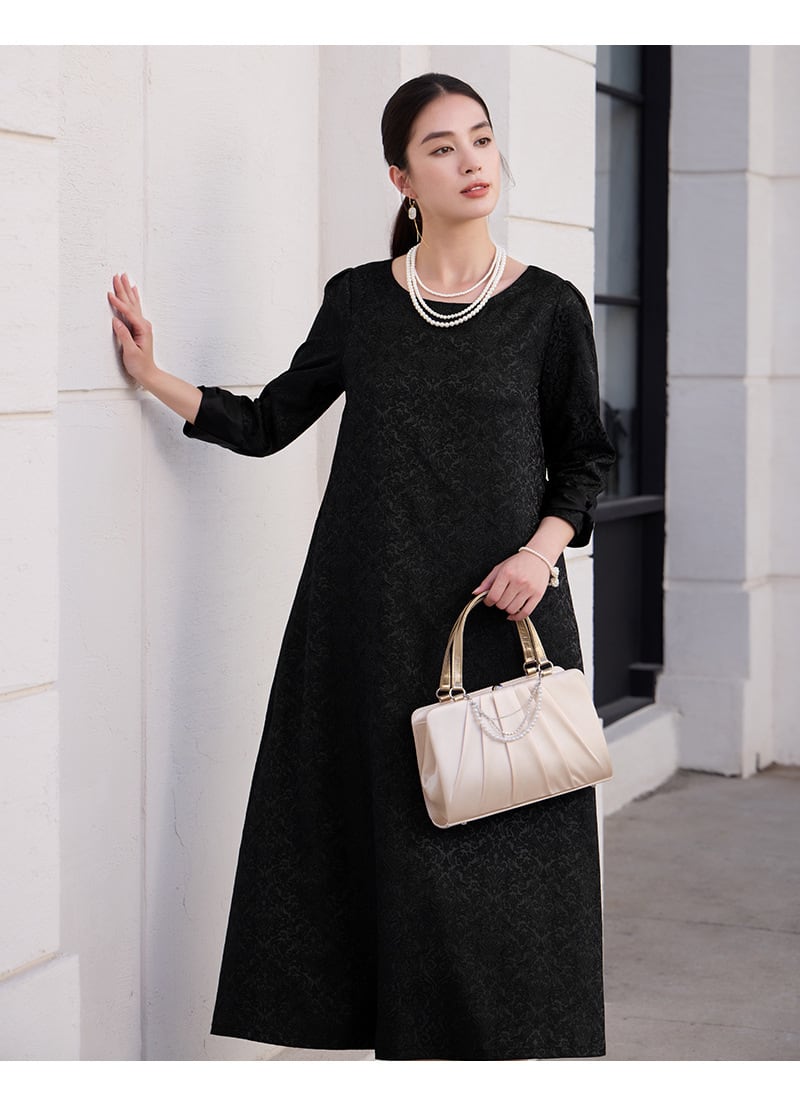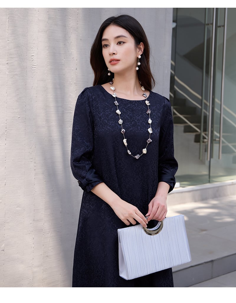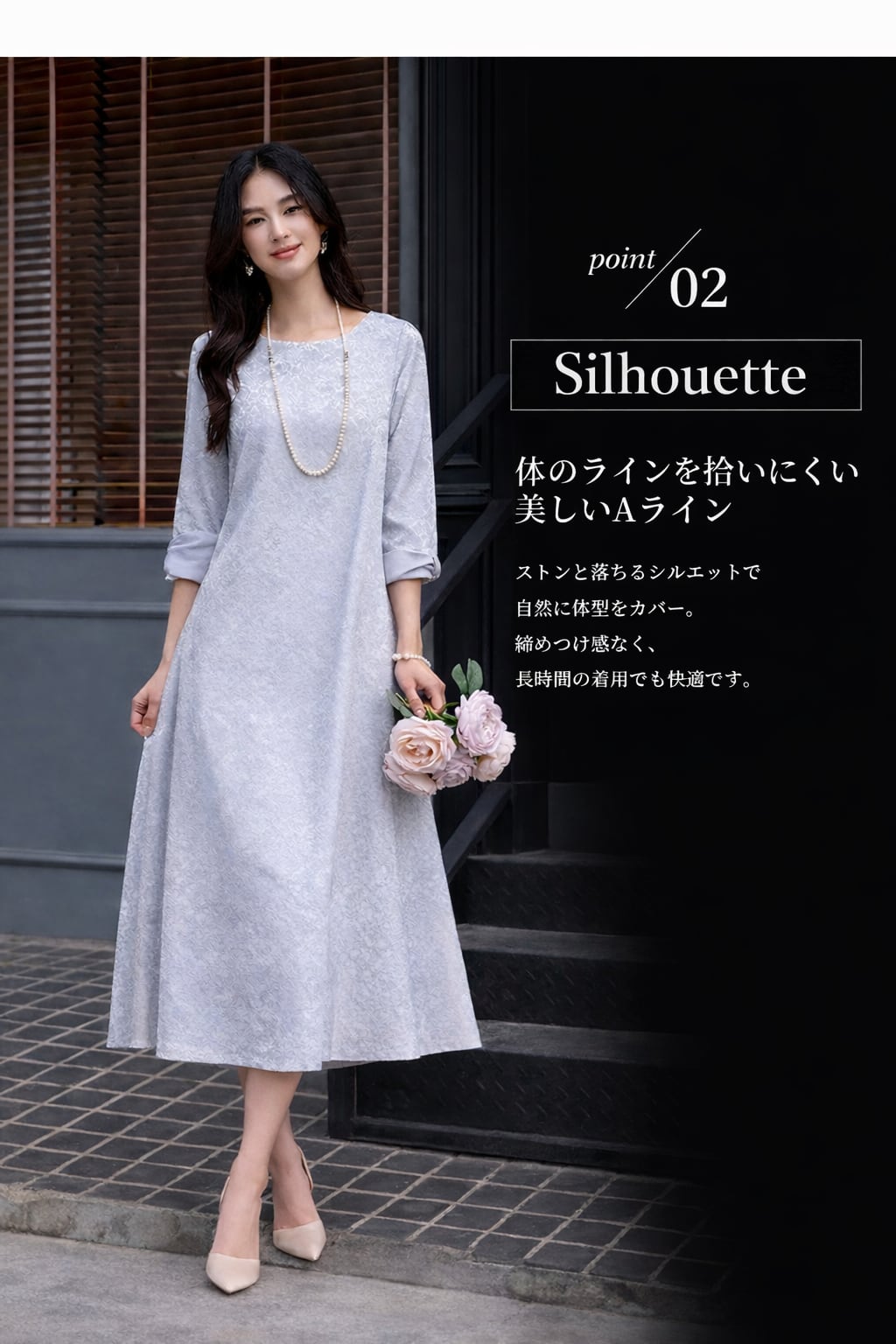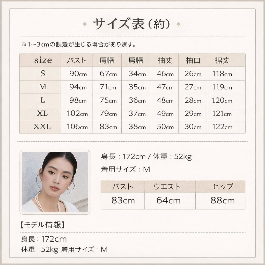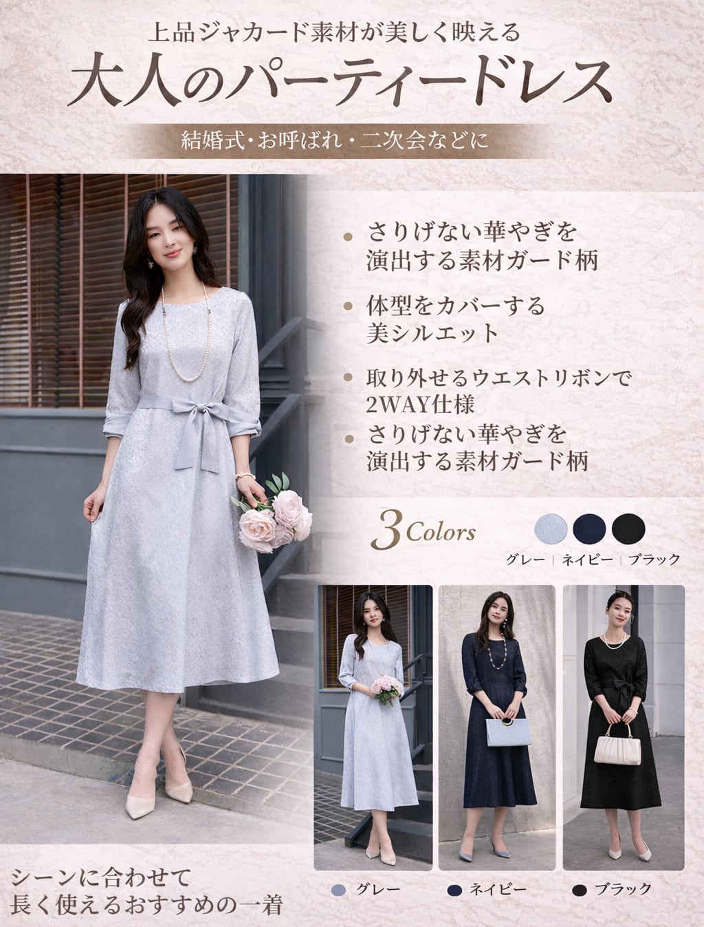 ご来店誠にありがとう御座います。 当店公式LINE【emile】にて割引クーポンをお配りしております。 LINE 追加特典 ・LINE追加で初回割引クーポン ・LINE限定クーポン ・新商品 SALE先行告知 お問い合わせ、ご質問はこちらから 【公式LINE】emile https://line.me/R/ti/p/%40vcv8428j ID:【@vcv8428j】 ※店舗担当者とトークで気軽にお問い合わせ頂けます。 ---------------------------------------------------- ご覧いただきましてありがとうございます。 「パーティードレス通販emile」でございます。 結婚式、パーティー、二次会、学校行事、デート、記念日、『特別な一日に。』 どんな場面のお洋服でも、こだわりの一着がみつかります! お手頃プライスと種類の多さで人気急上昇中! emileであなただけの特別な一着を見つけて下さい。 お呼ばれや特別な日のためのパーティードレスをメインに、アクセサリーやバッグ、シューズなど取り扱っております。大きいサイズも豊富に取りそろえております。 1点1点専用アイロンがけを行ってから出荷致します。心を込めて出荷させて頂きます。 上品なジャカード素材が映える、大人のためのパーティードレス。 繊細な織り柄が落ち着いた華やかさを演出し、結婚式お呼ばれや二次会などフォーマルなシーンにぴったりです。 ストンと落ちるAラインシルエットで体のラインを拾いにくく、自然に体型カバー。 七分袖の程よい透け感が二の腕をさりげなくカバーし、上品な印象に仕上げます。 取り外し可能なウエストリボン付きの2WAY仕様で、メリハリのある着こなしもシンプルな着こなしも楽しめます。 パーティードレスとしてはもちろん、お呼ばれドレスとして長く活躍する一着です。 サイズ(約) S バスト90cm 肩幅34cm 袖丈46cm 袖口26cm 裾丈118cm M バスト94cm 肩幅35cm 袖丈47cm 袖口27cm 裾丈119cm L バスト98cm 肩幅36cm 袖丈48cm 袖口28cm 裾丈120cm XL バスト102cm 肩幅37cm 袖丈49cm 袖口29cm 裾丈121cm XXL バスト106cm 肩幅38cm 袖丈50cm 袖口30cm 裾丈122cm モデルサイズ Sサイズ着用 身長172cm 体重52kg バスト83cm ウエスト64cm ヒップ88cm カラー グレー ネイビー ブラック