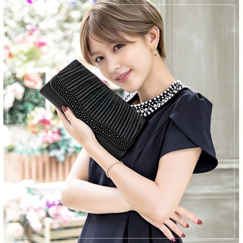 上質なプリーツサテンとパールの装飾で、持っているだけでエレガントな雰囲気になれちゃうクラッチバッグです♪