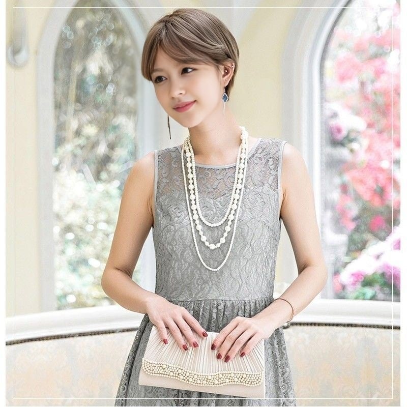 収納力に満足できる大きめなクラッチバッグ が人気ポイントの一つ、プリーツデザインに可愛いパールが施され、上品感UP!