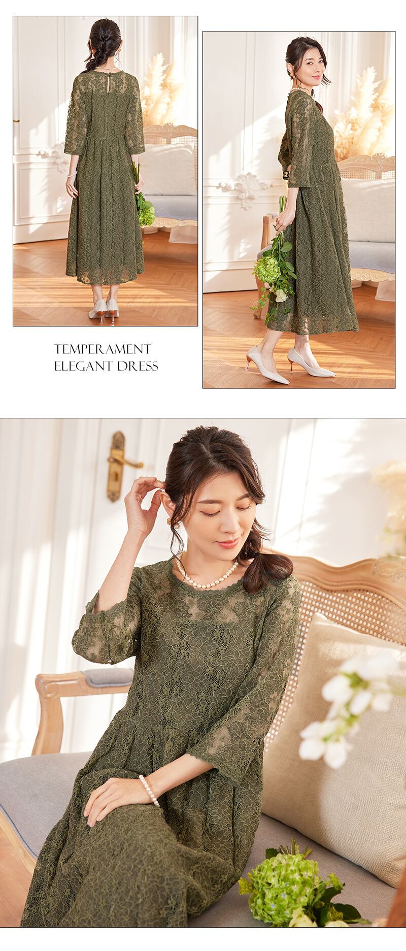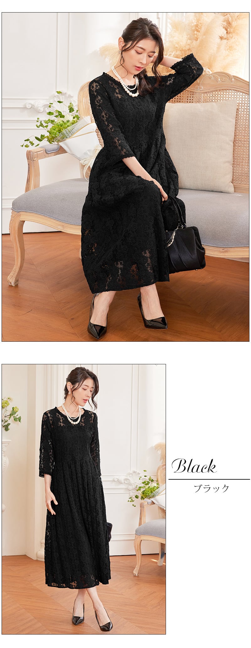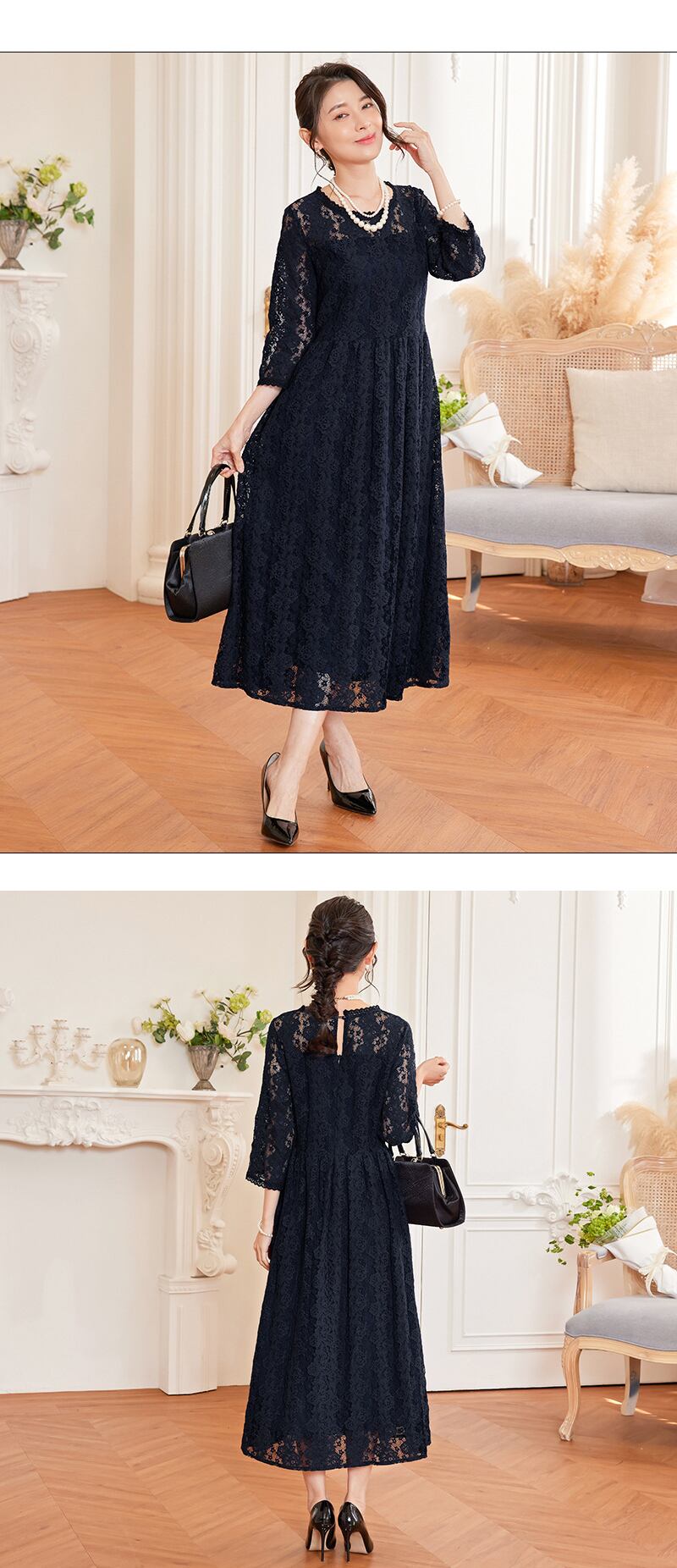 ご来店誠にありがとう御座います。 当店公式LINE【emile】にて割引クーポンをお配りしております。 LINE 追加特典 ・LINE追加で初回割引クーポン ・LINE限定クーポン ・新商品 SALE先行告知 お問い合わせ、ご質問はこちらから 【公式LINE】emile https://line.me/R/ti/p/%40vcv8428j ID:【@vcv8428j】 ※店舗担当者とトークで気軽にお問い合わせ頂けます。 ---------------------------------------------------- ご覧いただきましてありがとうございます。 「パーティードレス通販emile(エミール)」でございます。 結婚式、パーティー、二次会、学校行事、デート、記念日、『特別な一日に。』 どんな場面のお洋服でも、こだわりの一着がみつかります! お手頃プライスと種類の多さで人気急上昇中! emileであなただけの特別な一着を見つけて下さい。 お呼ばれや特別な日のためのパーティードレスをメインに、アクセサリーやバッグ、シューズなど取り扱っております。 全品送料無料!大きいサイズも豊富に取りそろえております。 1点1点専用アイロンがけを行ってから出荷致します。心を込めて出荷させて頂きます。 emileではサイズやカラーが合わなかった場合でも、交換対応させて頂きますので、 安心してネットショッピングを楽しんで頂けます。別の商品でも交換が可能で御座います。 360°エレガントな総レース大人色フレアワンピースドレス 繊細なレースとフェミニンなフレアシルエット シンプルなAラインのシルエットに、繊細な花柄レースが美しく映えるデザイン。スカート部分は360°フレアに広がり、柔らかなフリル感を加えてフェミニンな印象を与えます。レースの透け感が軽やかで華やかさを引き立て、全体的に軽やかな装いに仕上がります。 スッキリとした縦長印象を与えるストライプ模様 レースに施されたストライプ模様が、視覚的に縦長のラインを強調し、スタイルアップ効果をもたらします。エレガントでありながら、シャープな印象も与えるデザインで、洗練された雰囲気を作り出します。 上品な透け感とセンシュアルなディテール ヨーク、袖、裾部分には繊細な透け感を残して、上品でありながらセンシュアルな肌見せが叶います。小ぶりのスカラップレースがネックラインや袖口を飾り、細部にわたるディテールにこだわったデザインが大人女性にふさわしいエレガントさを演出します。 着脱が簡単でトレンド感をアップ 後ろ開きのボタンとバックファスナーが施されており、着脱が簡単で忙しいシーンでも楽に着ることができます。さらに、トレンド感のあるバックスタイルで、後ろ姿も華やかに決まります。 幅広いシーンで活躍する多用途ドレス 上品なレース素材が高見え効果を発揮し、結婚式や二次会、披露宴、お呼ばれ、成人式、同窓会などのフォーマルなシーンにぴったり。シワになりにくく、持ち運びにも便利なため、旅行や長時間のイベントにも最適です。落ち着いたカラーバリエーションで、幅広い世代に対応し、様々なシーンにマッチします。 サイズ(約) S 着丈113cm、 バスト88cm、 ウエスト73cm、 肩幅37cm、 袖丈42cm、 ヒップ136cm M 着丈114cm、 バスト92cm、 ウエスト77cm、 肩幅38cm、 袖丈43cm、 ヒップ140cm L 着丈115cm、 バスト96cm、 ウエスト81cm、 肩幅39cm、 袖丈44cm、 ヒップ144cm XL 着丈116cm、 バスト100cm、 ウエスト85cm、 肩幅40cm、 袖丈45cm、 ヒップ148cm XXL 着丈117cm、 バスト104cm、 ウエスト89cm、 肩幅41cm、 袖丈46cm、 ヒップ152cm モデル着用サイズS 身長165cm バスト78cm ウエスト60cm ヒップ82cm カラー ブラック、オリーブグリーン、パープル、ネイビー 素材 ポリエステル100% 裏地 あり ファスナー あり 生地の厚さ 普通 透け感 なし 生地の伸縮性 なし
