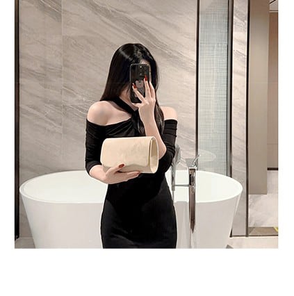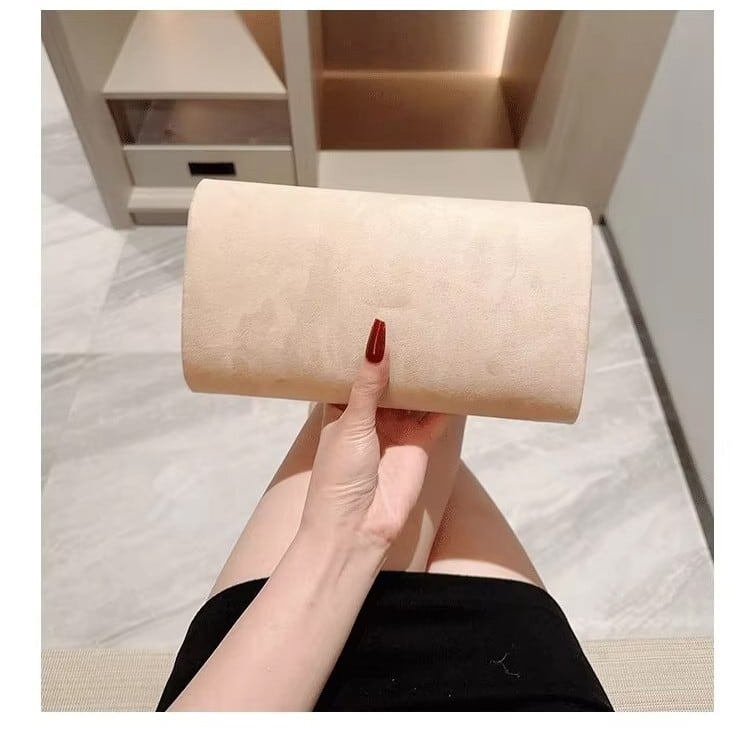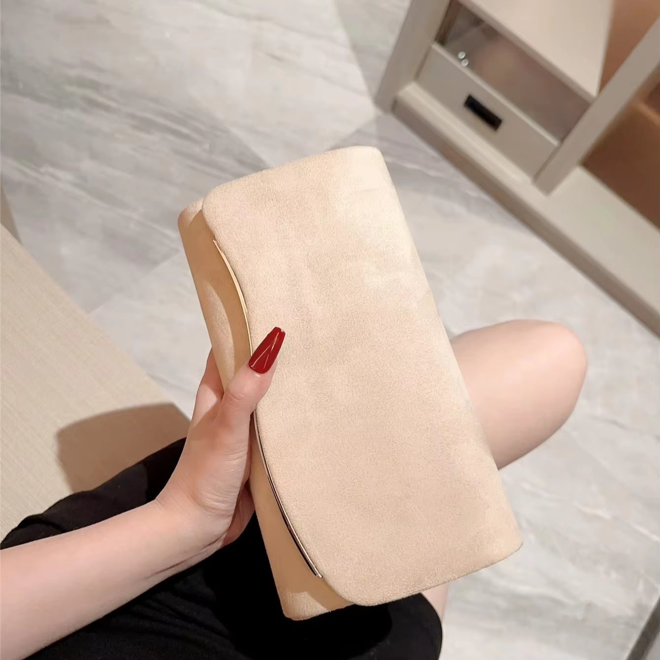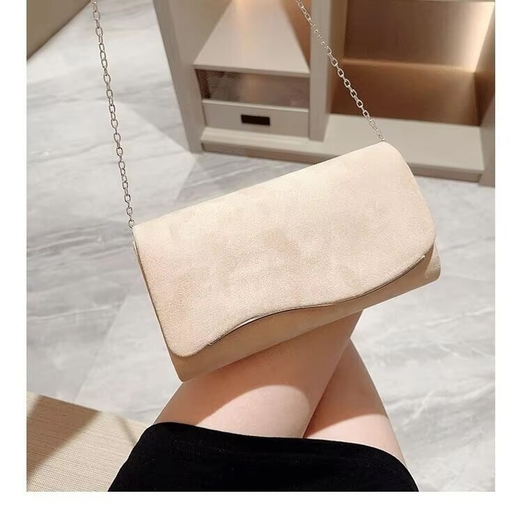 やわらかいスエード調が手元に上品さを添えるパーティーバッグ。