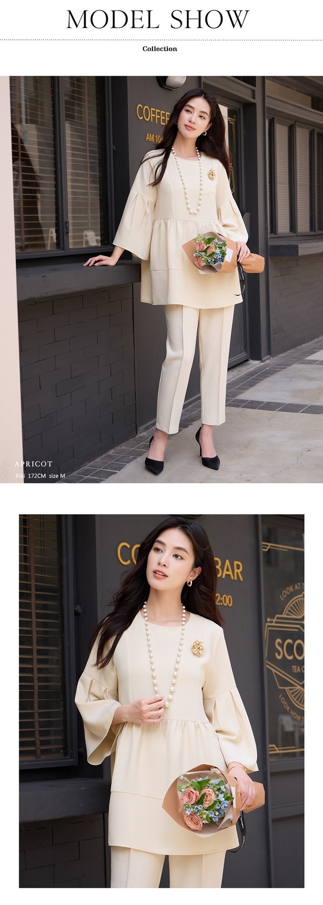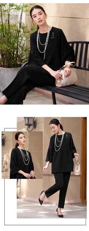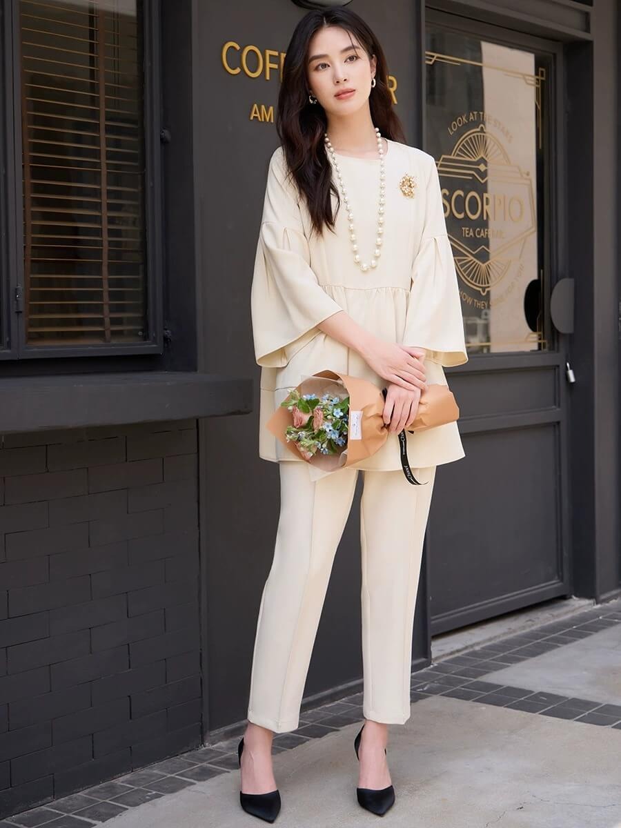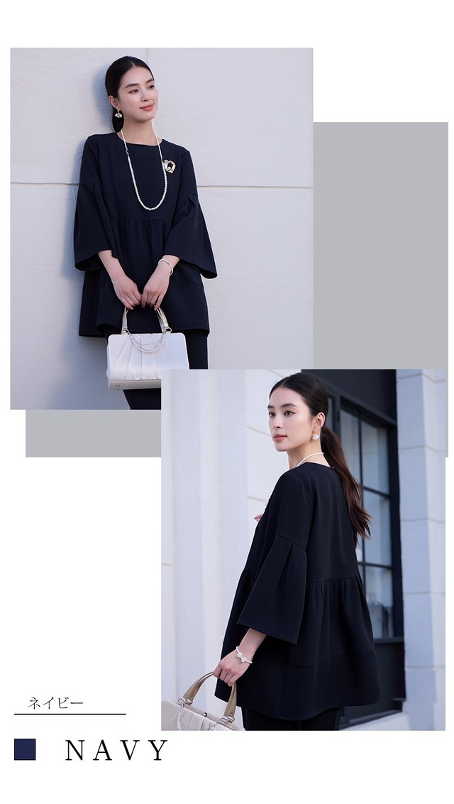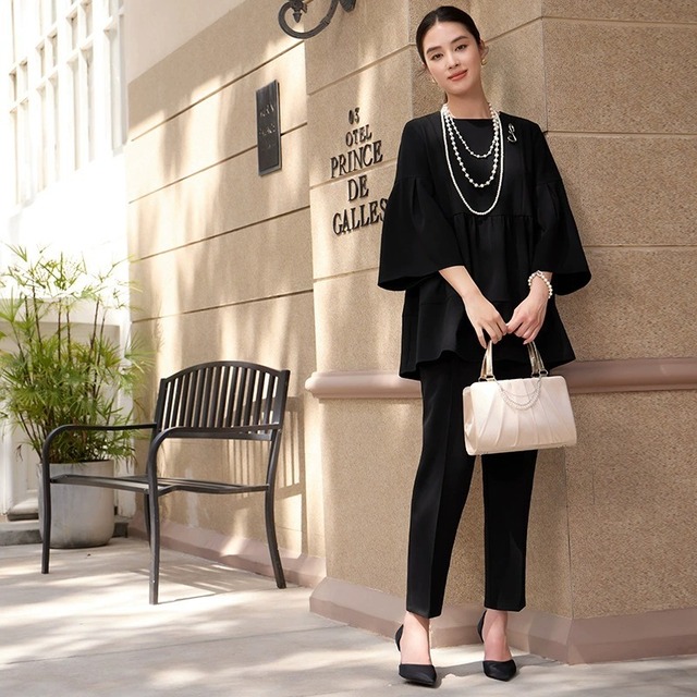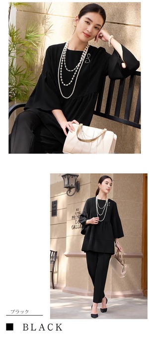 ご来店誠にありがとう御座います。 当店公式LINE【emile】にて割引クーポンをお配りしております。 LINE 追加特典 ・LINE追加で初回割引クーポン ・LINE限定クーポン ・新商品 SALE先行告知 お問い合わせ、ご質問はこちらから 【公式LINE】emile https://line.me/R/ti/p/%40vcv8428j ID:【@vcv8428j】 ※店舗担当者とトークで気軽にお問い合わせ頂けます。 ---------------------------------------------------- 上品な印象を演出する、3カラーのパンツスーツセットアップ。 体のラインを拾わないゆったりシルエットで、動きやすく長時間の着用も快適。 トップスはウエスト切り替えのティアードデザインが華やかさを添え、程よいボリューム袖が気になる腕まわりをカバーします。 パンツはすっきりとしたラインで、美脚効果を叶えるシルエット。 浮きたくもないけど、埋もれたくもない。 そんなあなたにぴったりの、程よい華やかさと品のあるデザイン。 結婚式のお呼ばれやパーティー、入卒式、食事会などフォーマルな場面にぴったり。 小物次第でフォーマルにもセミカジュアルにも着こなせる、万能な1着です。 サイズ(約) 【トップス】 S バスト98cm 肩幅36cm 袖丈43cm 袖口55cm 着丈70cm M バスト102cm 肩幅37cm 袖丈44cm 袖口56cm 着丈71cm L バスト106cm 肩幅38cm 袖丈45cm 袖口57cm 着丈72cm XL バスト110cm 肩幅39cm 袖丈46cm 袖口58cm 着丈73cm XXL バスト114cm 肩幅40cm 袖丈47cm 袖口59cm 着丈74cm 【ボトムス】 S ウエスト66〜76cm ヒップ102cm 裾口33cm 総丈96cm M ウエスト70〜80cm ヒップ106cm 裾口35cm 総丈97cm L ウエスト74〜84cm ヒップ110cm 裾口37cm 総丈98cm XL ウエスト78〜88cm ヒップ114cm 裾口39cm 総丈99cm XXL ウエスト82〜92cm ヒップ118cm 裾口41cm 総丈100cm モデルサイズ Sサイズ着用 身長172cm 体重52kg バスト83cm ウエスト64cm ヒップ88cm 透け感 なし 生地の厚さ 普通 伸縮性 なし 素材 ポリエステル100% カラー アプリコット、ネイビー、ブラック