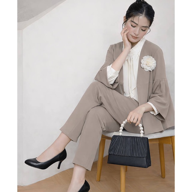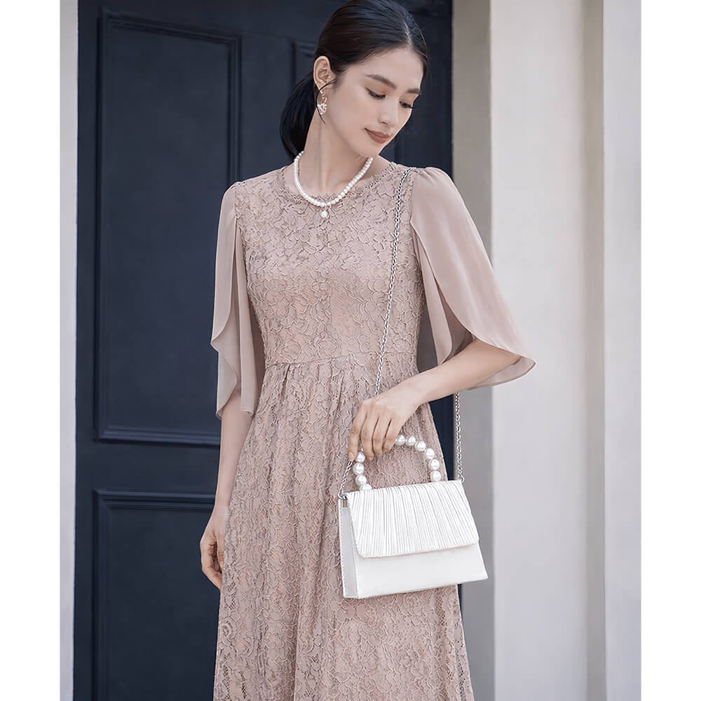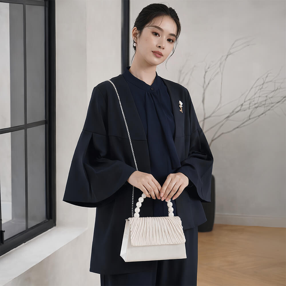 繊細なプリーツを施したフラップと、艶感のある素材が華やかさと落ち着きを両立し、パーティードレスやお呼ばれドレス、結婚式お呼ばれの装いに自然になじみます。