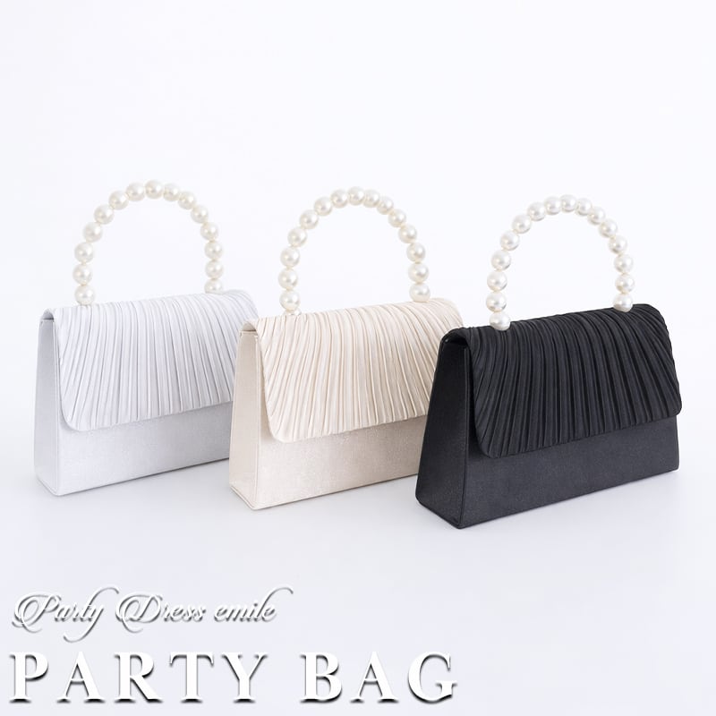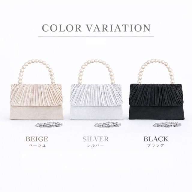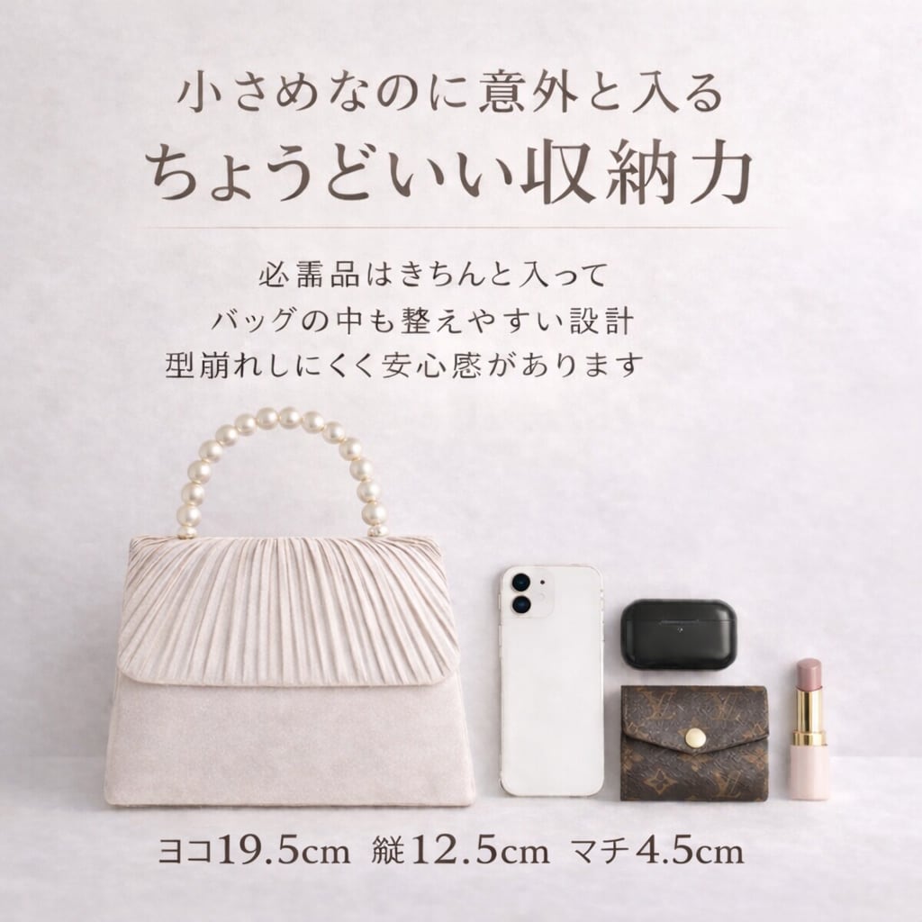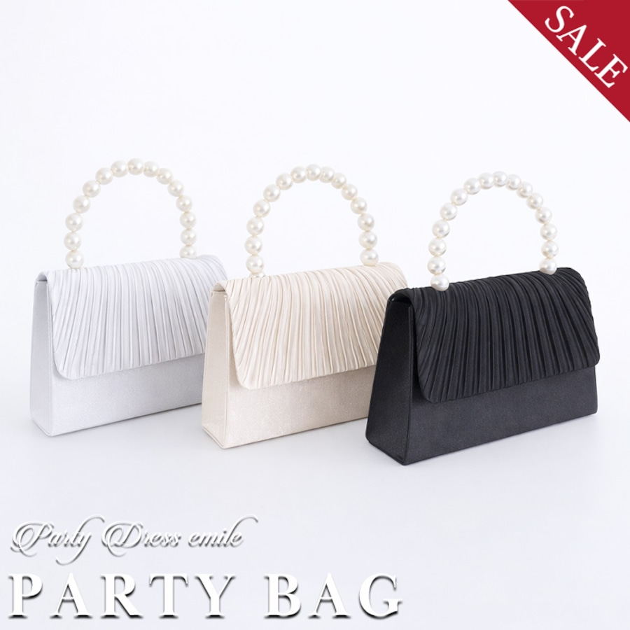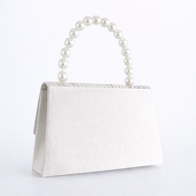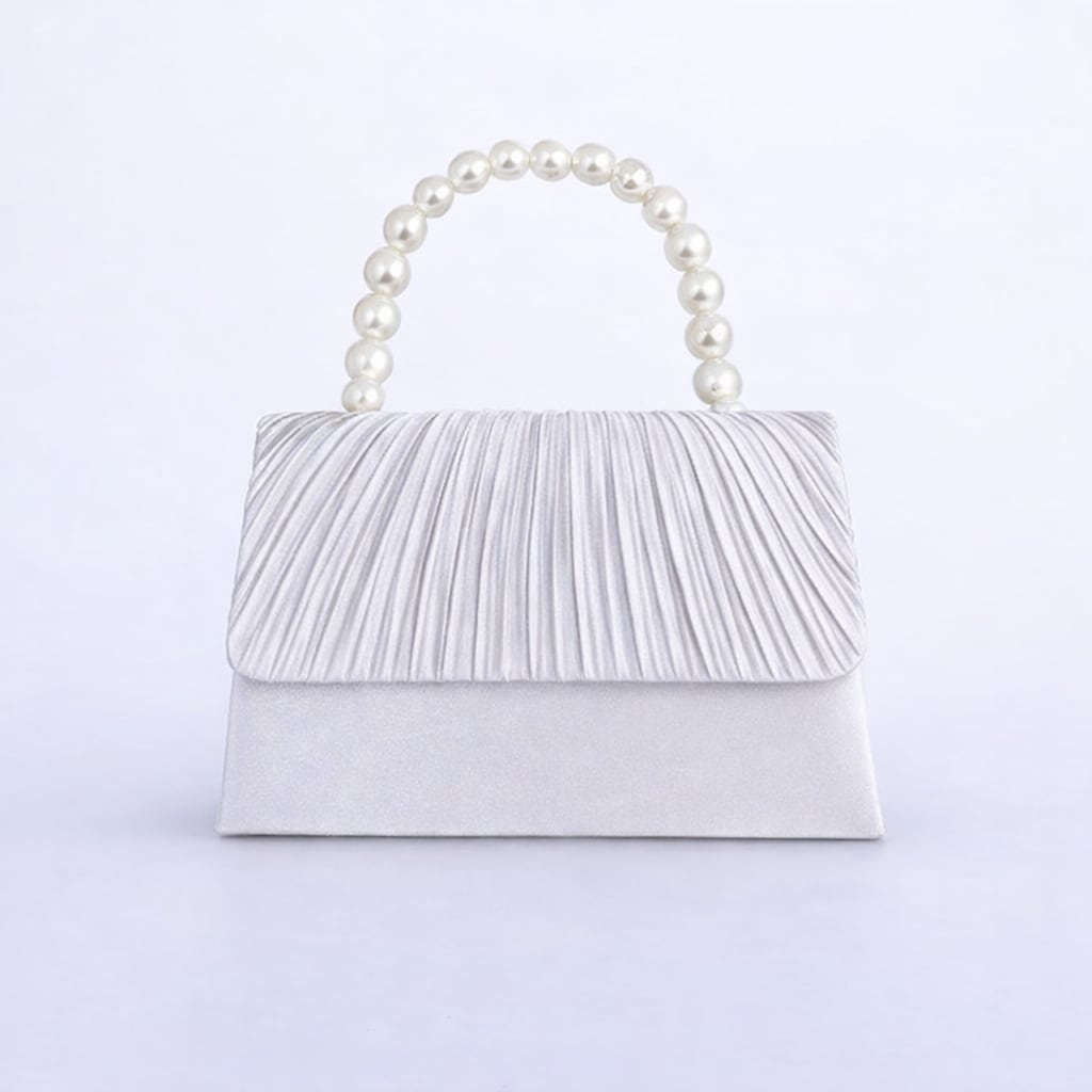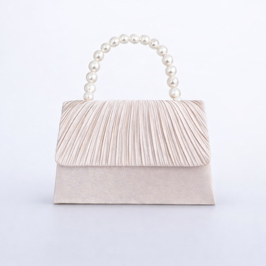 上品なプリーツデザインとパールハンドルが目を引く、結婚式やフォーマルシーンにぴったりのパーティーバッグ。