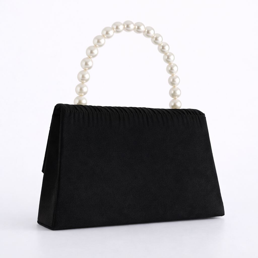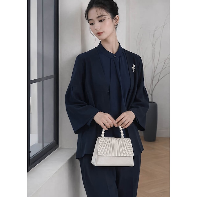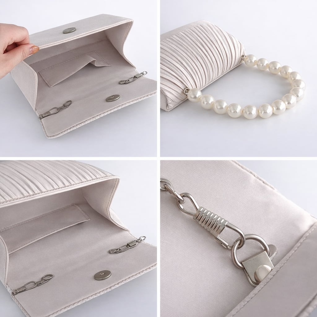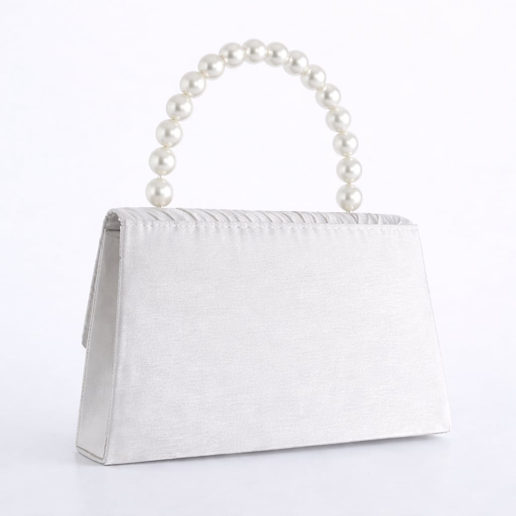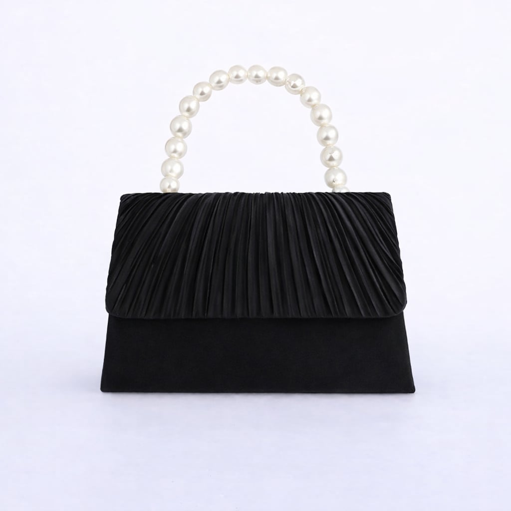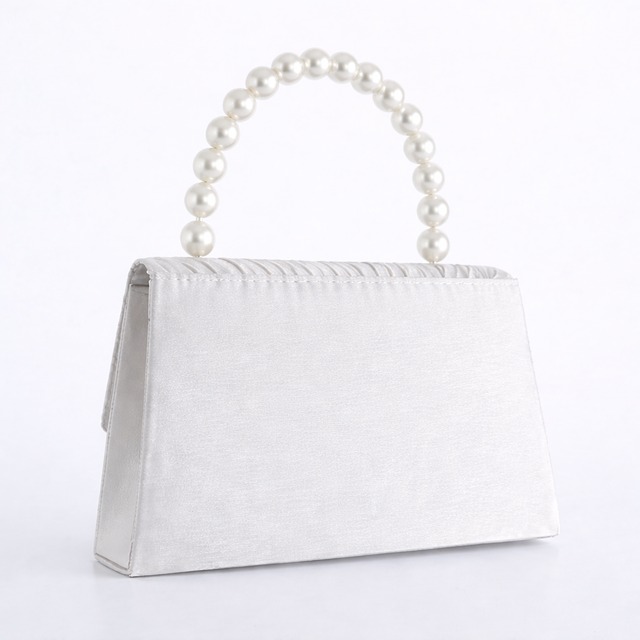 上品なプリーツデザインとパールハンドルが目を引く、結婚式やフォーマルシーンにぴったりのパーティーバッグ。
