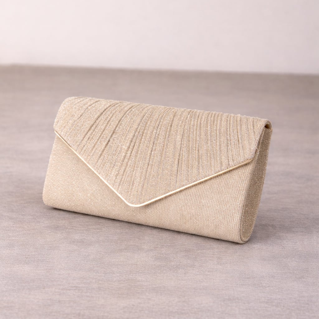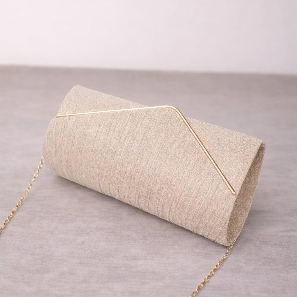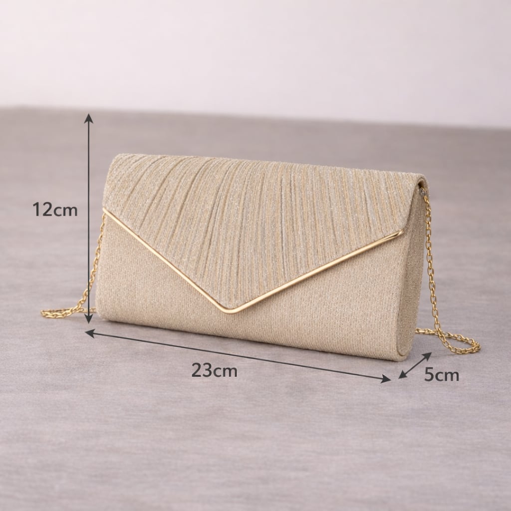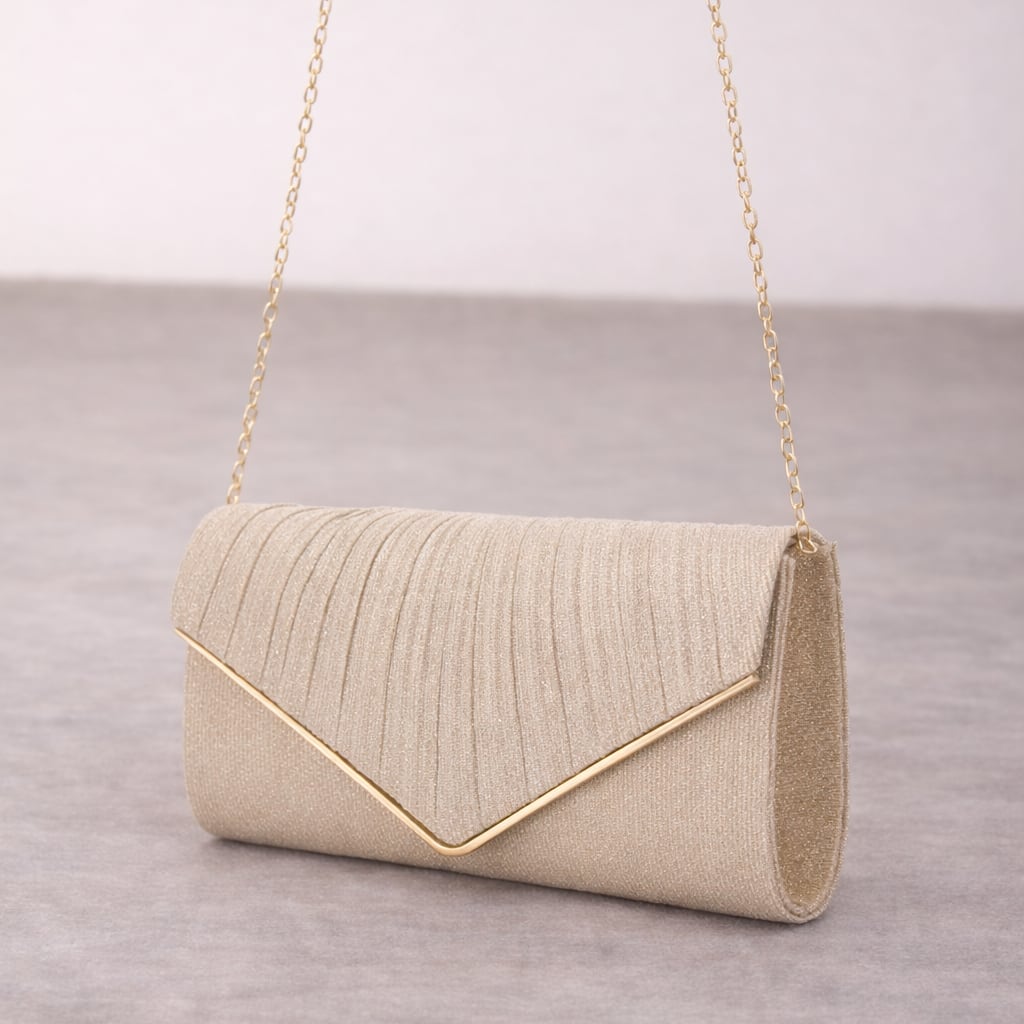 クラシックなデザイン: プリーツ加工のフラップが上品さを演出。V字ラインとゴールドの縁取りが洗練されたアクセントを加えます。