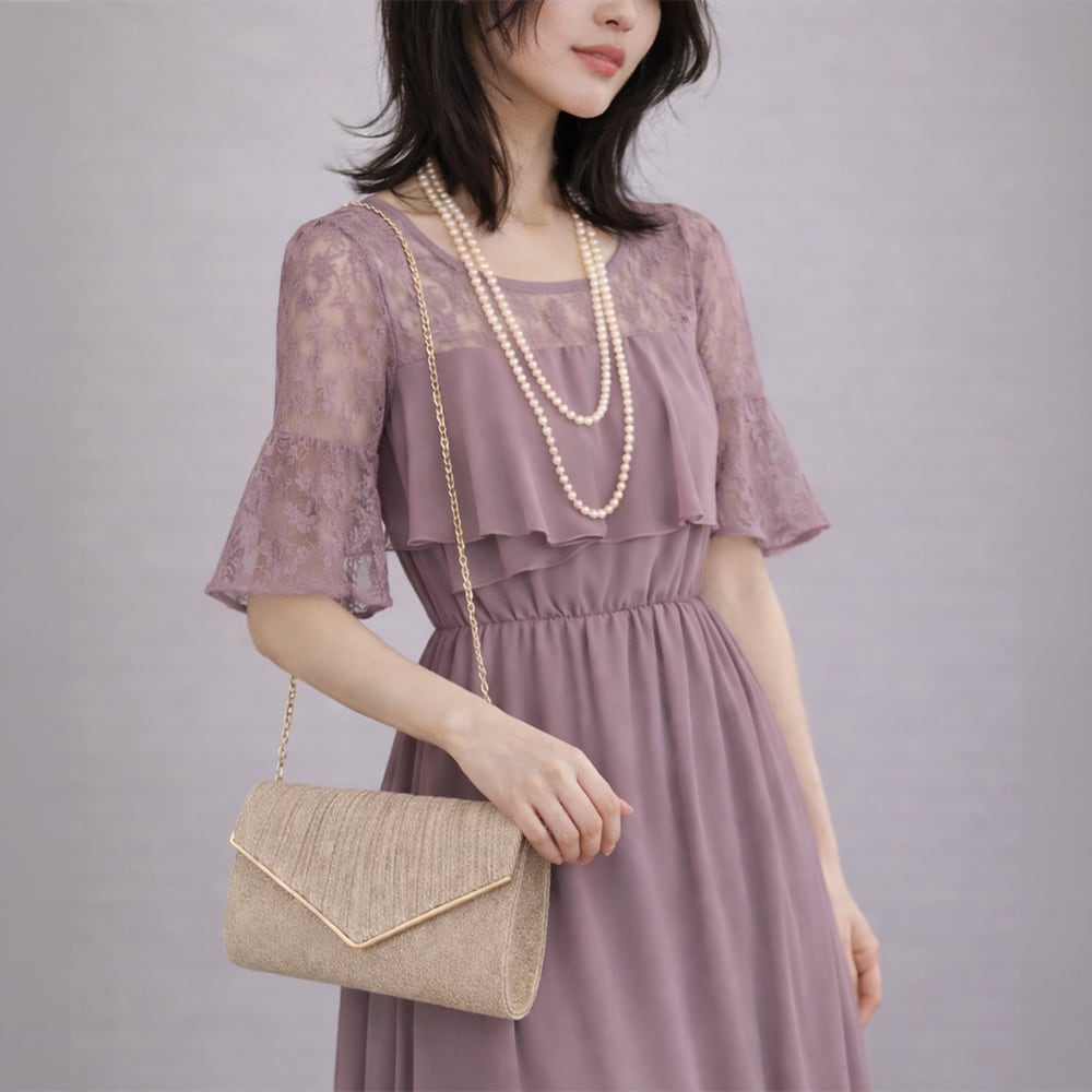 ラメ素材: 角度によってきらめくラメ入り素材がパーティーシーンを華やかに彩ります。シンプルながら高級感あふれる仕上がり。