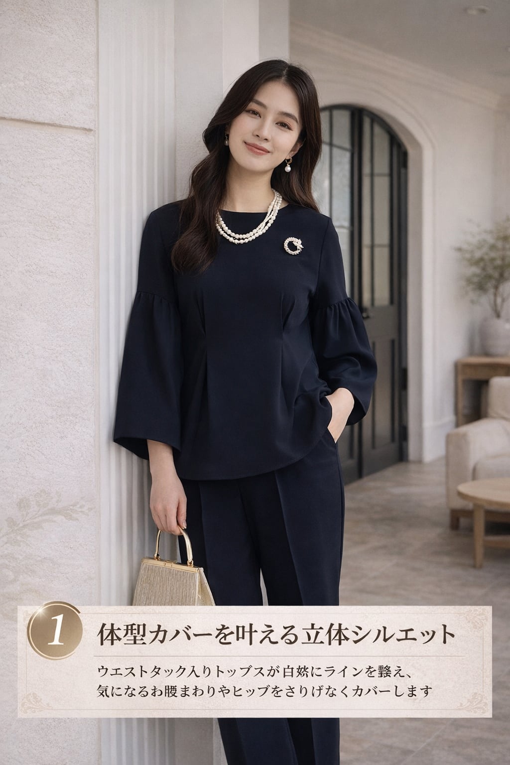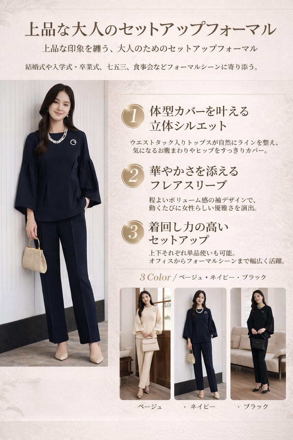 上品さ、体型カバー、着回し力。