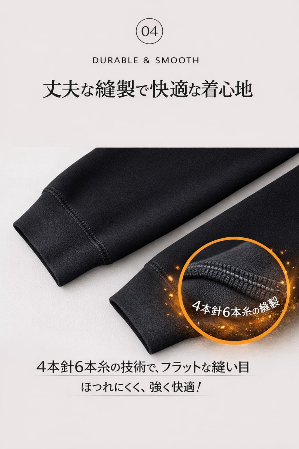 4本針6本糸の丈夫な縫製で、フラットな縫い目が肌あたりも快適。
