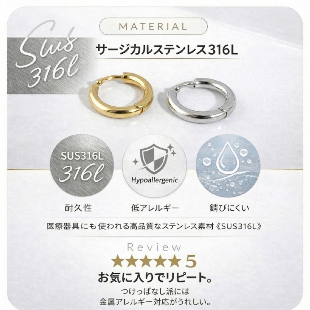 素材にはサージカルステンレス316Lを使用し、金属アレルギーに配慮したやさしいつけ心地に仕上げました。